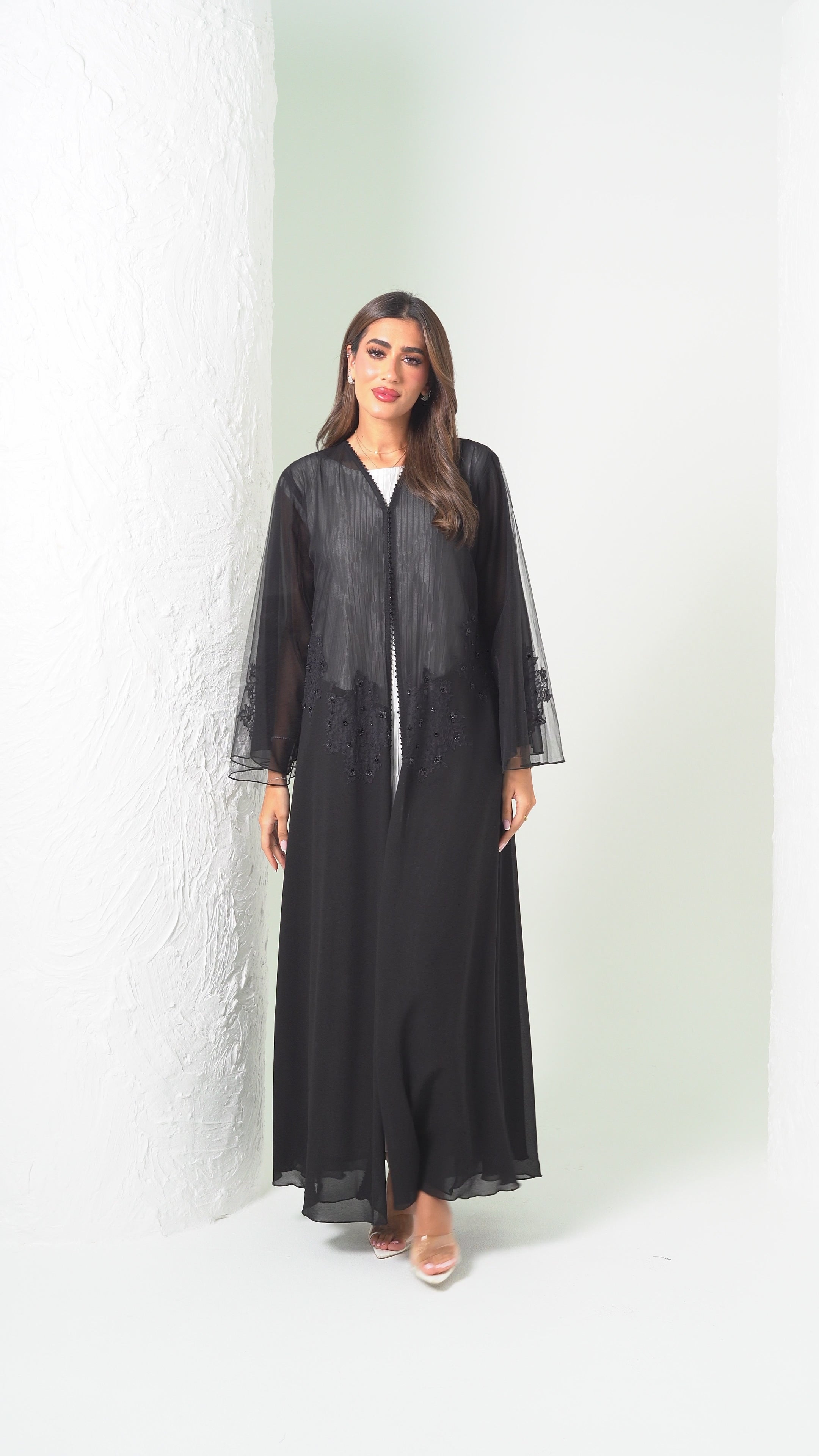 Introducing our stunning  Designer collection abaya, exquisitely designed with a touch of elegance. The abaya features a sleek finish with premium francy Dantil and beads handwork . Sheila  included.