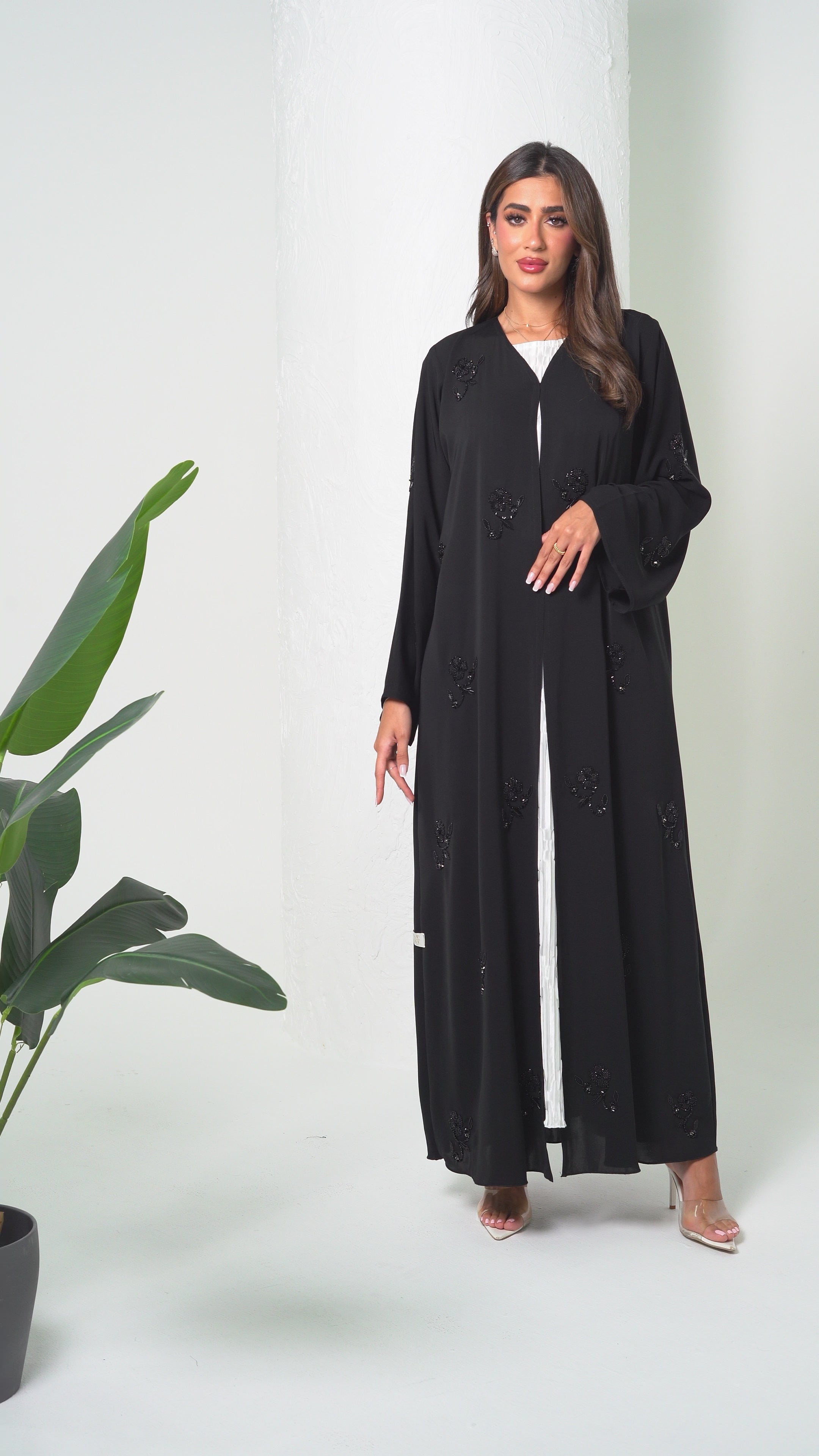 Introducing our stunning  Designer collection abaya, exquisitely designed with a touch of elegance. The abaya features a sleek finish with beautiful flower design beads  and handwork. Sheila  included.